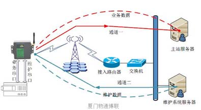 現(xiàn)場(chǎng)采集設(shè)備的業(yè)務(wù)串口與維護(hù)串口分別與無線模塊化的串口一和串口二相連。正常通信的時(shí)候業(yè)務(wù)數(shù)據(jù)只走通道一,實(shí)現(xiàn)配網(wǎng)自動(dòng)化。當(dāng)需要對(duì)采集設(shè)備進(jìn)行維護(hù)的時(shí)候維護(hù)系統(tǒng)服務(wù)器與無線模塊建立通道二,實(shí)現(xiàn)遠(yuǎn)程維護(hù)的功能。