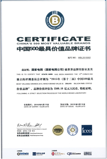 近日,由世界品牌實驗室組織的2015年中國500最具價值品牌發(fā)布會在北京召開,國家電網公司以2508.18億元的品牌價值,名列中國500最具價值品牌排行榜第二名,品牌價值與2014年相比提升了92.56億元,品牌價值連續(xù)9年持續(xù)攀升。